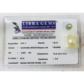 REPORT NO . LPV 1CLARITY . N/ACOLOUR . SHINING WHITESHAPE / CUT . ROUNDWT . 6.83 CTSDIMENSION . 9-9.10-1.9-4.R . INDEX  . N/AHARDNESS . 3.0COMMENT . FRESH WATER PEARL { V }..
