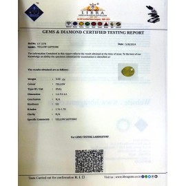 REPORT NO . LY 61CLARITY . N/ACOLOUR . YELLOWSHAPE / CUT . OVALWT . 6.18 CTSDIMENSION . 2-5.8-4.5-9.R . INDEX . 1.76-1.78HARDNESS . 9.0COMMENT . YELLOW SAPPHIRE..