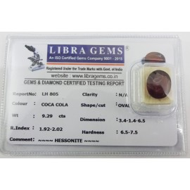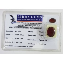 REPORT.NO.-LH 396CLARITY.-N/ACOLOUR.-COCA COLASHAPE/CUT.-OVALWT.-9.90 CTSDIMENSION.-4-8.1-7.5-7.R.INDEX.-1.92-2.02HARDNESS.-6.5-7.5COMMENT.-HESSONITE..
