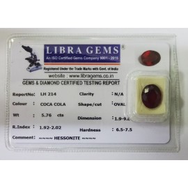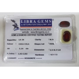 REPORT NO . LH 39CLARITY . N/ACOLOUR . COCA COLASHAPE / CUT . OVALWT . 5.14 CTSDIMENSION . 2-5.8-3.5-8.R . INDEX . 1.92-2.02HARDNESS . 6.5-7.5COMMENT . HESSONITE..