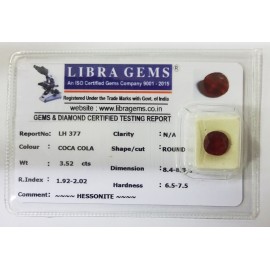 REPORT.NO.-LH 377CLARITY.-N/ACOLOUR.-COCA COLASHAPE/CUT.-ROUNDWT.-3.52 CTSDIMENSION.-8-4.8-3.5-6.R.INDEX.-1.92-2.02HARDNESS.-6.5-7.5COMMENT.-HESSONITE..