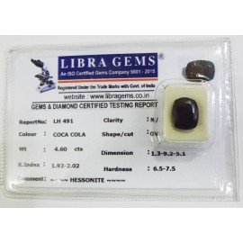 REPORT.NO.-LH 214CLARITY.-N/ACOLOUR.-COCA COLASHAPE/CUT.-OVALWT.-5.76 CTSDIMENSION.-1.9-9.8-6.2R.INDEX.-1.92-2.02HARDNESS.-6.5-7.5COMMENT.-HESSONITE..
