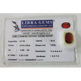 REPORT NO . LH 90CLARITY . N/ACOLOUR . COCA COLASHAPE / CUT . OVALWT . 3.98 CTSDIMENSION . 2-2.8-6.4-1.R . INDEX . 1.92-2.02HARDNESS . 6.5-7.5COMMENT . HESSONITE..