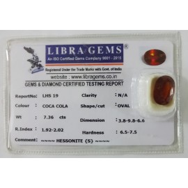 REPORT NO . LHS 19CLARITY . N/ACOLOUR . COCA COLASHAPE / CUT . OVALWT . 7.36 CTSDIMENSION . 3-6.9-8.6-6.R . INDEX . 1.92-2.02HARDNESS . 6.5-7.5COMMENT . HESSONITE { S }..