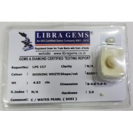 REPORT NO . LPS 157CLARITY . N/ACOLOUR . SHINING WHITESHAPE / CUT . ROUNDWT . 4.63 CTSDIMENSION . 8-4.8-5.8-6.R . INDEX . N/AHARDNESS . 3.0COMMENT . C / WATER PEARL { SOSI }..