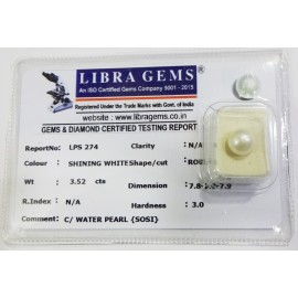 REPORT.NO.-LPS 274CLARITY.-N/ACOLOUR.-SHINING WHITESHAPE/CUT.-ROUNDWT.-3.52 CTSDIMENSION.-7-8.7-9.7-9.R.INDEX.-N/AHARDNESS.-3.0COMMENT.-C / WATER PEARL { SOSI }..
