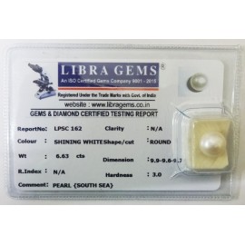 REPORT.NO.LPSC 162CLARITY.N/ACOLOUR.SHINING WHITESHAPE/CUT.ROUNDWT.6.63 CTSDIMENSION.9.9-9.6-9.7R.INDEX.N/AHARDNESS.3.0COMMENT.PEARL{SOUTH SEA}..
