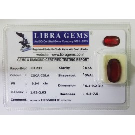 REPORT.NO.-LHS 152CLARITY.-N/ACOLOUR.-COCA COLASHAPE/CUT.-OVALWT.-4.70 CTSDIMENSION.-2-1.8-7.5-1.R.INDEX.-1.92-2.02HARDNESS.-6.5-7.5COMMENT.-HESSONITE { S }..