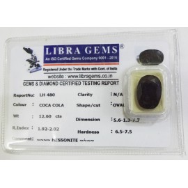 REPORT.NO.-LH 480CLARITY.-N/ACOLOUR.-COCA COLASHAPE/CUT.-OVALWT.-12.60 CTSDIMENSION.-5-6.1-3.7-7.R.INDEX.-1.92-2.02HARDNESS.-6.5-7.5COMMENT.-HESSONITE..