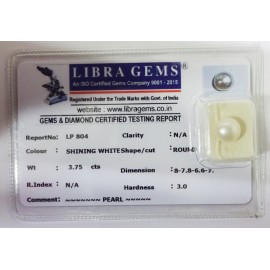REPORT NO . LP 804CLARITY . N/ACOLOUR . SHINING WHITESHAPE / CUT . ROUNDWT . 3.75 CTSDIMENSION . 8-7.8-6.6-7.R . INDEX . N/AHARDNESS . 3.0COMMENT . PEARL..