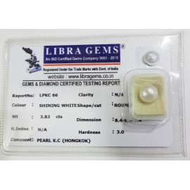 REPORT.NO.-LPKC 66CLARITY.-N/ACOLOUR.-SHINING WHITESHAPE/CUT.-ROUNDWT.-3.83 CTSDIMENSION.-8-4.8-4.7-4.R.INDEX.-N/AHARDNESS.-3.0COMMENT.-PEARL K.C { HONGKOK }..