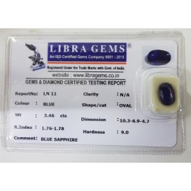 REPORT NO . LN 11CLARITY . N/ACOLOUR . BLUESHAPE / CUT . OVALWT . 3.46 CTSDIMENSION . 10-3.6-9.4-7.R . INDEX . 1.76-1.78HARDNESS . 9.0COMMENT . BLUE SAPPHIRE..