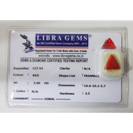 REPORT.NO. LCI 774CLARITY. N/ACOLOUR. REDSHAPE/CUT. TRIANGLEWT. 3.72 CTSDIMENSION. 9.4-10.3-6.1R.INDEX. N/AHARDNESS. 3.5COMMENT. CORAl..