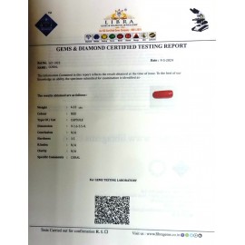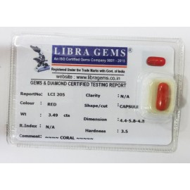 REPORT NO . LCI 205CLARITY . N/ACOLOUR . REDSHAPE / CUT . CAPSULEWT . 3.49 CTSDIMENSION . 4-4.5-8.4-8.R . INDEX . N/AHARDNESS . 3.5COMMENT . CORAL..