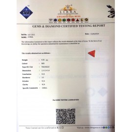 REPORT NO. LCI 54CLARITY. N/ACOLOUR. REDSHAPE/CUT. TRIANGLEWT. 3.60 CTSDIMENSION. 10.6-10.1-5.7R. INDEX. N/AHARDNESS. 3.5COMMENT. CORAL..