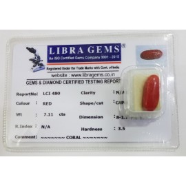 REPORT.NO.LCI 480CLARITY.N/ACOLOUR.REDSHAPE/CUT.CAPSULEWT.7.11 CTSDIMENSION.8.1-7.7-5.9R.INDEX.N/AHARDNESS.3.5COMMENT.CORAL..