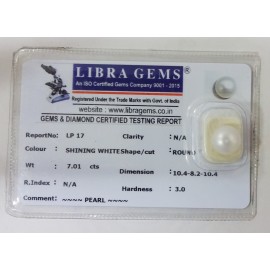 REPORT NO . LP 17CLARITY . N/ACOLOUR . SHINING WHITESHAPE / CUT . ROUNDWT . 7.01 CTSDIMENSION . 10-4.8-2.10-4.R . INDEX . N/AHARDNESS . 3.0COMMENT . PEARL..