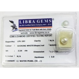 REPORT.NO.-LPS 283CLARITY.-N/ACOLOUR.-SHINING WHITESHAPE/CUT.-ROUNDWT.-3.54 CTSDIMENSION.-7-7.7-8.7-9.R.INDEX.-N/AHARDNESS.-3.0COMMENT.-C / WATER PEARL { SOSI }..