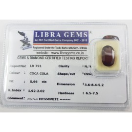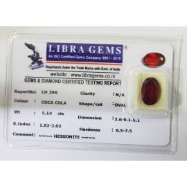 REPORT.NO.-LH 296CLARITY.-N/ACOLOUR.-COCA COLASHAPE/CUT.-OVALWT.-5.14 CTSDIMENSION.-3-6.9-1.5-1.R.INDEX.-1.92-2.02HARDNESS.-6.5-7.5COMMENT.-HESSONITE..