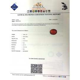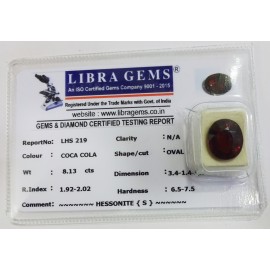 DATE: 15-4-2025REF.NO: LHS 456NAME: HESSONITEWEIGHT: 4.94 CTSCOLOUR: COCA COLATYPE OF/CUT: OVALDIMENSION: 1.4-9.8-5.4/CONCLUSION: N/AHARDNESS: 6.5-7.5R.INDEX: 1.92-2.02CLARITY: N/ASPECIFIC COMMENTS: H..