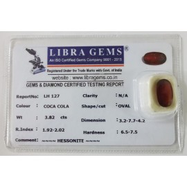 REPORT NO . LH 127CLARITY . N/ACOLOUR . COCA COLASHAPE / CUT . OVALWT . 3.82 CTSDIMENSION . 3-2.7-7.4-2.R . INDEX . 1.92-2.02HARDNESS . 6.5-7.5COMMENT . HESSONITE..