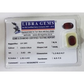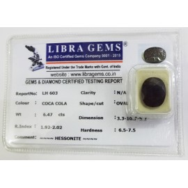 REPORT.NO.-LH 603CLARITY.-N/ACOLOUR.-COCA COLASHAPE/CUT.-OVALWT.-6.47 CTSDIMENSION.-3-3.10-7.5-2.R.INDEX.-1.92-2.02HARDNESS.-6.5-7.5COMMENT.-HESSONITE..