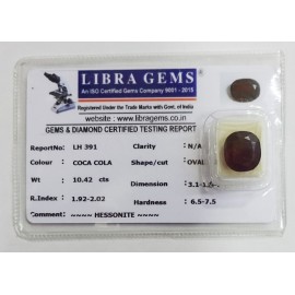REPORT.NO.-LH 391CLARITY.-N/ACOLOUR.-COCA COLASHAPE/CUT.-OVALWT.-10.42 CTSDIMENSION.-3-1.1-8.7-4.R.INDEX.-1.92-2.02HARDNESS.-6.5-7.5COMMENT.-HESSONITE..