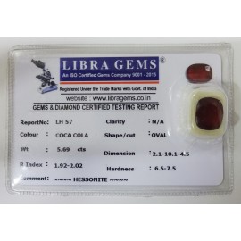 REPORT NO . LH 57CLARITY . N/ACOLOUR . COCA COLASHAPE / CUT . OVALWT . 5.69 CTSDIMENSION . 2-1.10-1.4-5.R . INDEX . 1.92-2.02HARDNESS . 6.5-7.5COMMENT . HESSONITE..