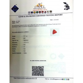 REPORT.NO.LCI 778CLARITY.N/ACOLOUR.REDSHAPE/CUT.TRIANGLEWT.3.13 CTSDIMENSION.1.1-10.3-4.3R.INDEX.N/AHARDNESS.3.5COMMENT.CORAL..