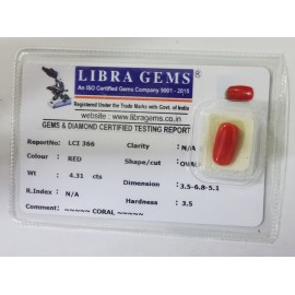 REPORT NO . LCI 366CLARITY . N/ACOLOUR . REDSHAPE / CUT . OVALWT . 4.31 CTSDIMENSION . 3-5.6-8.5-1.R . INDEX . N/AHARDNESS . 3.5COMMENT . CORAL..