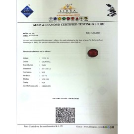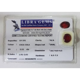 REPORT NO . LH 191CLARITY . N/ACOLOUR . COCA COLASHAPE / CUT . OVALWT . 3.52 CTSDIMENSION . 10-7.8-9.4-5.R . INDEX . 1.92-2.02HARDNESS . 6.5-7.5COMMENT . HESSONITE..