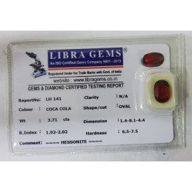 REPORT NO . LH 141CLARITY . N/ACOLOUR . COCA COLASHAPE / CUT . OVALWT . 3.71 CTSDIMENSION . 1-4.8-1.4-4.R . INDEX . 1.92-2.02HARDNESS . 6.5-7.5COMMENT . HESSONITE..