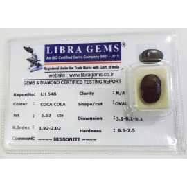 REPORT.NO.-LH 548CLARITY.-N/ACOLOUR.-COCA COLASHAPE/CUT.-OVALWT.-5.53 CTSDIMENSION.-3-1.9-1.5-1.R.INDEX.-1.92-2.02HARDNESS.-6.5-7.5COMMENT.-HESSONITE..