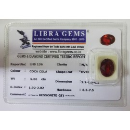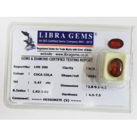 REPORT.NO.-LHS 200CLARITY.-N/ACOLOUR.-COCA COLASHAPE/CUT.-OVALWT.-5.47 CTSDIMENSION.-2-8.9-1.5-1.R.INDEX.-1.92-2.02HARDNESS.-6.5-7.5COMMENT.-HESSONITE { S}..