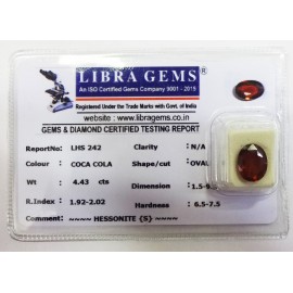 REPORT.NO.LHS 242CLARITY.N/ACOLOUR.COCA COLASHAPE/CUT.OVALWT.4.43 CTSDIMENSION.1.5-9.1-4.6R.INDEX.1.92-2.02HARDNESS.6.5-7.5COMMENT.HESSONITE {S}..