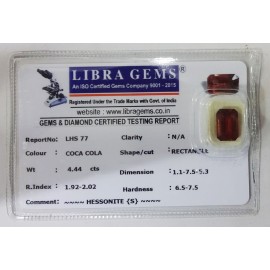 REPORT NO . LHS 77CLARITY . N/ACOLOUR . COCA COLASHAPE / CUT . RECTANGLEWT . 4.44 CTSDIMENSION . 1-1.7-5.5-3.R . INDEX . 1.92-2.02HARDNESS . 6.5-7.5COMMENT . HESSONITE { S }..