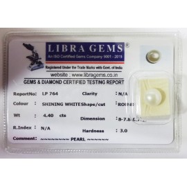 REPORT NO . LP 764CLARITY . N/ACOLOUR . SHINING WHITESHAPE / CUT . ROUNDWT . 4.40 CTSDIMENSION . 8-7.8-8.7-1.R . INDEX . N/AHARDNESS . 3.0COMMENT . PEARL..
