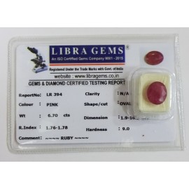 REPORT.NO.-LR 394CLARITY.-N/ACOLOUR.-PINKSHAPE/CUT.-OVALWT.-6.70 CTSDIMENSION.-1-9.10-2.5-4.R.INDEX.-1.76-1.78HARDNESS.-9.0COMMENT.-RUBY..