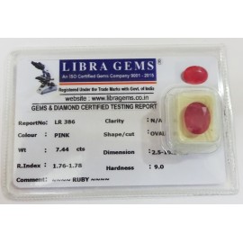 REPORT.NO.-LR 386CLARITY.-N/ACOLOUR.-PINKSHAPE/CUT.-OVALWT.-7.44 CTSDIMENSION.-2-5.10-2.5-9.R.INDEX.-1.76-1.78HARDNESS.-9.0COMMENT.-RUBY..