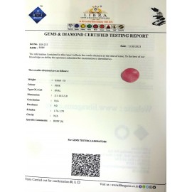REPORT.NO.-LRA 81CLARITY.-N/ACOLOUR.-PINKSHAPE/CUT.-OVALWT.-4.72 CTSDIMENSION.-10.9-9.1-5.1R.INDEX.-1.76-1.78HARDNESS.-9.0COMMENT.-RUBY{A}..