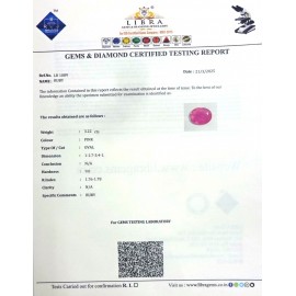 DATE: 21-3-2025REF.NO: LR 1089NAME: RUBYWEIGHT: 3.22 CTSCOLOUR: PINKTYPE OF/CUT: OVALDIMENSION: 1.1-7.3-4.1/CONCLUSION: N/AHARDNESS: 9.0R.INDEX: 1.76-1.78CLARITY: N/ASPECIFIC COMMENTS: RUBY..