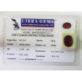 REPORT.NO.-LHS 100CLARITY.-N/ACOLOUR.-COCA COLASHAPE/CUT.-OVALWT.-4.76 CTSDIMENSION.-10.2-9.2-6.4R.INDEX.-1.92-2.02HARDNESS.-6.5-7.5COMMENT.-HESSONITE {S}..