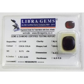 REPORT.NO.-LH 599CLARITY.-N/ACOLOUR.-COCA COLASHAPE/CUT.-OVALWT.-10.28 CTSDIMENSION.-5-6.1-3.6-9.R.INDEX.-1.92-2.02HARDNESS.-6.5-7.5COMMENT.-HESSONITE..