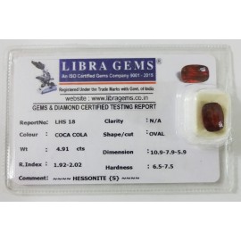 REPORT NO . LH 60CLARITY . N/ACOLOUR . COCA COLASHAPE / CUT . OVALWT . 4.89 CTSDIMENSION . 10-9.8-8.5-1.R . INDEX . 1.92-2.02HARDNESS . 6.5-7.5COMMENT . HESSONITE..