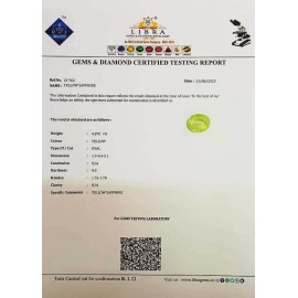 REPORT.NO.-LYA 161CLARITY.-N/ACOLOUR.-YELLOWSHAPE/CUT.-OVALWT.-4.90 CTSDIMENSION.-1-9.8-9.4-2.R.INDEX.-1.76-1.78HARDNESS.-9.0COMMENT.-YELLOW SAPPHIRE { A }..