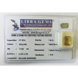 REPORT.NO.LY 407CLARITY.N/ACOLOUR.YELLOWSHAPE/CUT.RECTANGLEWT.6.42 CTSDIMENSION.1.3-9.8-4.6R.INDEX.1.76-1.78HARDNESS.9.0COMMENT.YELLOW SAPPHIRE..