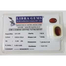 REPORT NO . LH 135CLARITY . N/ACOLOUR . COCA COLASHAPE / CUT . OVALWT . 3.44 CTSDIMENSION . 2-8.8-4.3-8.R . INDEX . 1.92-2.02HARDNESS . 6.5-7.5COMMENT . HESSONITE..