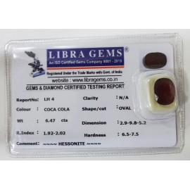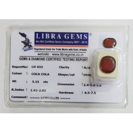 REPORT.NO.-LH 432CLARITY.-N/ACOLOUR.-COCA COLASHAPE/CUT.-OVALWT.-5.15 CTSDIMENSION.-2-4.1-2.3-8.R.INDEX.-1.92-2.02HARDNESS.-6.5-7.5COMMENT.-HESSONITE..