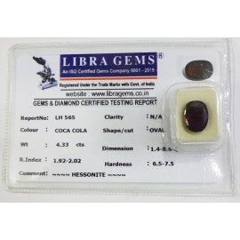 REPORT.NO.-LH 565CLARITY.-N/ACOLOUR.-COCA COLASHAPE/CUT.-OVALWT.-4.33 CTSDIMENSION.-1-4.8-6.4-8.R.INDEX.-1.92-2.02HARDNESS.-6.5-7.5COMMENT.-HESSONITE..