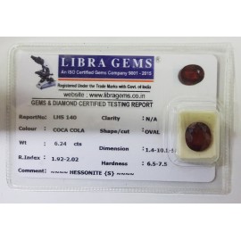 REPORT.NO.-LHS 140CLARITY.-N/ACOLOUR.-COCA COLASHAPE/CUT.-OVALWT.-6.24 CTSDIMENSION.-1.4-10.1-5.7R.INDEX.-1.92-2.02HARDNESS.-6.5-7.5COMMENT.-HESSONITE {S}..